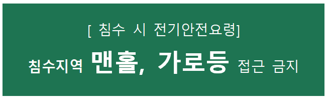 비가 오기 전, 먼저 누전차단기가 잘 작동하는지 체크하고, 건물 외벽과 같은 곳에 노출된 전선들이 피복은 벗겨진 곳은 없는지 잘 살핍니다. 주변이 침수 되었을 경우에는 안전한 곳에 머물며 외출을 자제하고 특히 맨홀과 가로등에는 접근을 하지 말아야 합니다.
